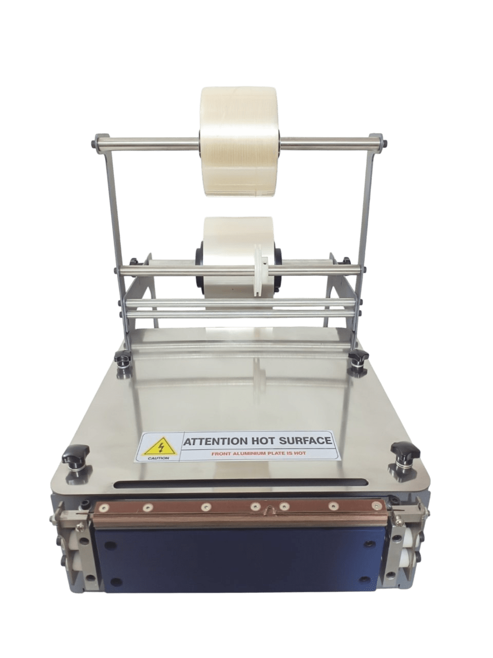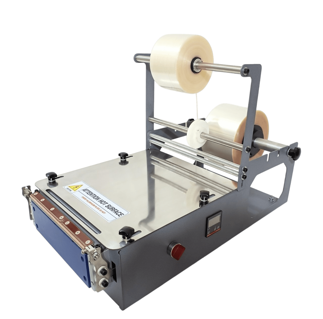 | Basic Operation | Manual film placement using pre-cut sheets (no continuous film roll) | Manual placement of product and pre-cut film; operator folds film around box and activates dot sealer for closure | Manual product placement and film folding; operator wraps film around the carton and activates heat sealing | Manual product placement and film folding; integrated tear-tape insertion during wrapping |